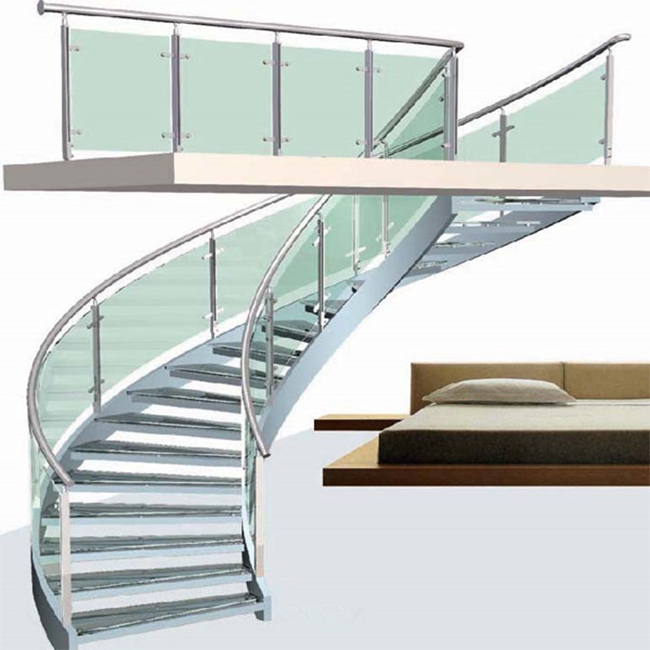 American client's Curved Staircase: stainless steel sleeve beam + laminated tempered glass tread + baluster glass railing