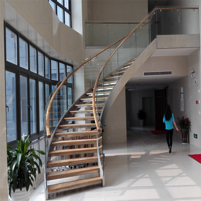American client's Curved Staircase: stainless steel sleeve beam + laminated tempered glass tread + baluster glass railing